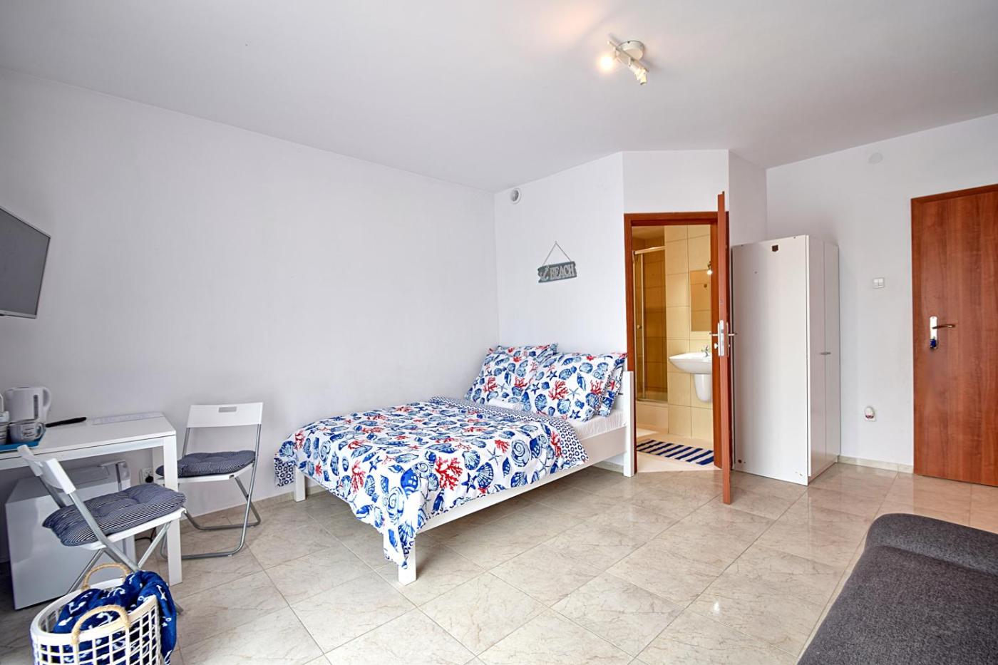 Pokój Czteroosobowy. The quadruple room features a safe deposit box and a high chair for children, as well as a private bathroom boasting a shower. Guests will find a stovetop, a refrigerator, kitchenware and an electric kettle in the well-equipped kitchen. The quadruple room also includes a barbecue. The quadruple room has tiled floors, a seating area with a flat-screen TV with satellite channels, a private entrance, a dining area, as well as a wardrobe. The unit has 2 beds. Pokój Czteroosobowy - 4 osobowy. Powierzchnia pokoju ok.: 30 mkw. ;